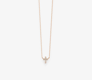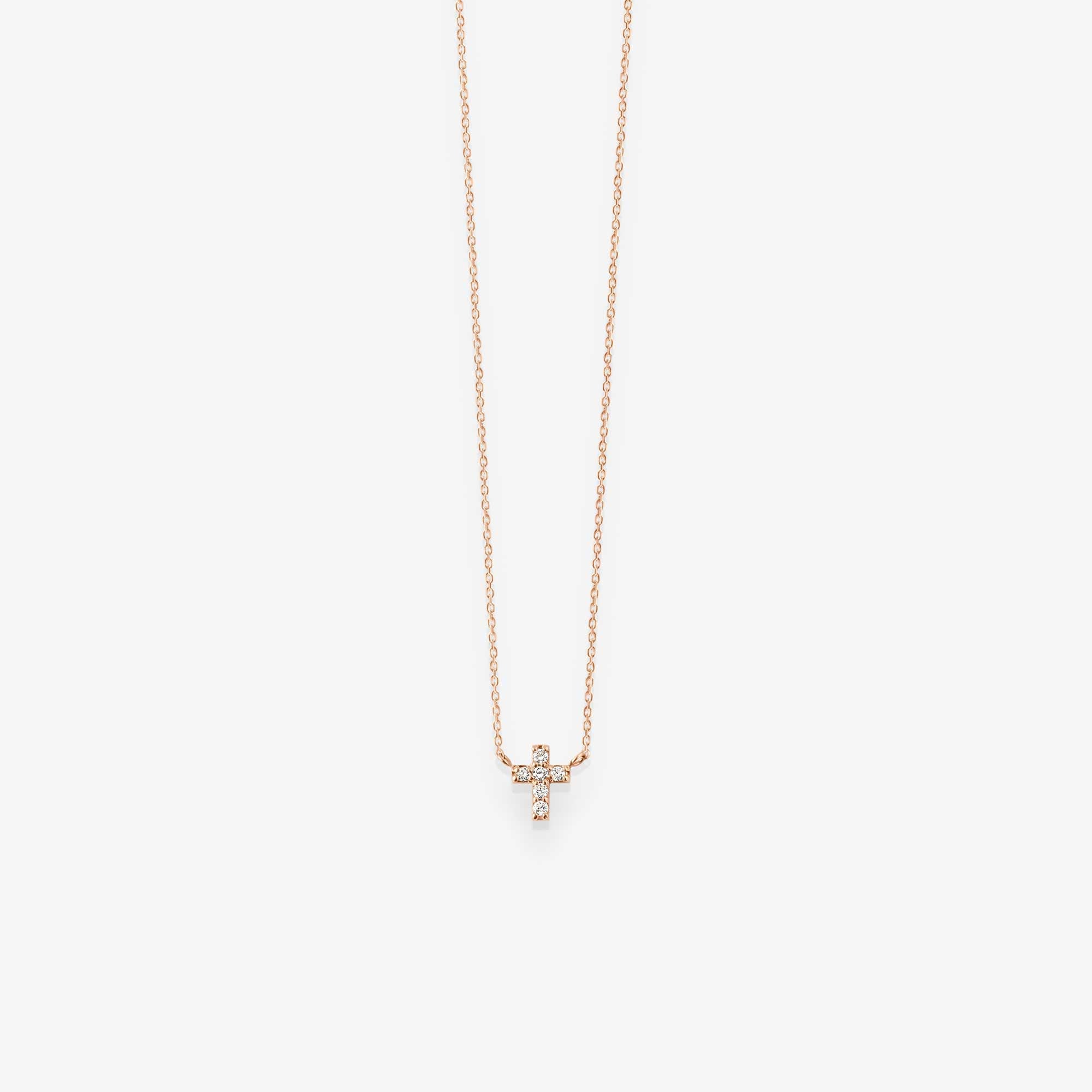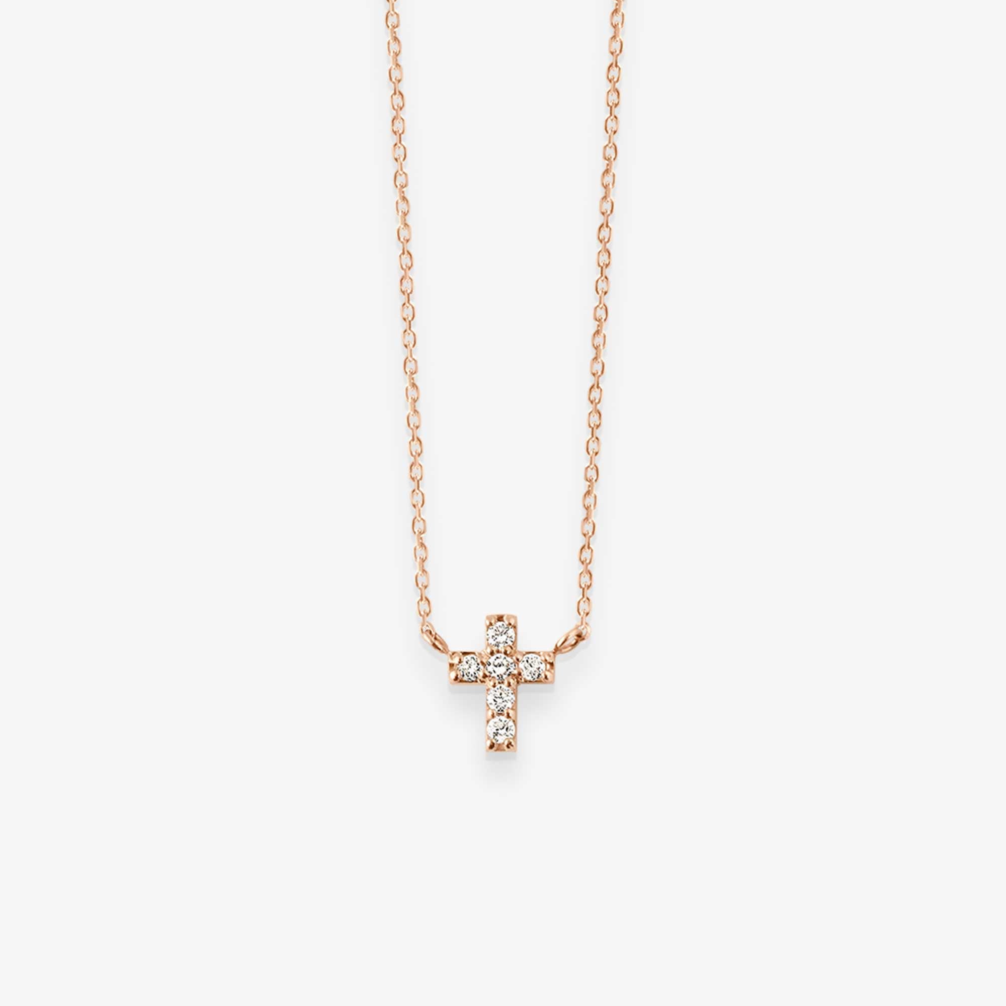 Or rose 18k et diamantsCette mini croix joue avec les codes du bijou classique tout en offrant une allure résolument contemporaine. Sertie de six diamants qui captent la lumière avec une intensité subtile, chaque détail brille avec une pureté étonnante. Un bijou qui parle par sa simplicité, sa finesse et la lumière qu'il dégage.
