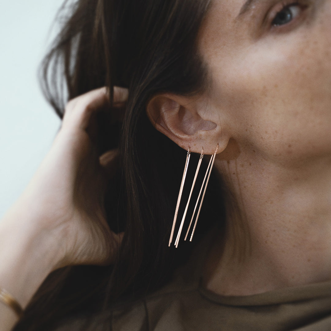 Or rose 18kUne mono boucle d'oreille d'une luxueuse simplicité. Deux délicates tiges d'or reliées par une fine chaîne reflètent la lumière au gré des mouvements. Adepte du cool sans effort, cette boucle d'oreille est faite pour vous !