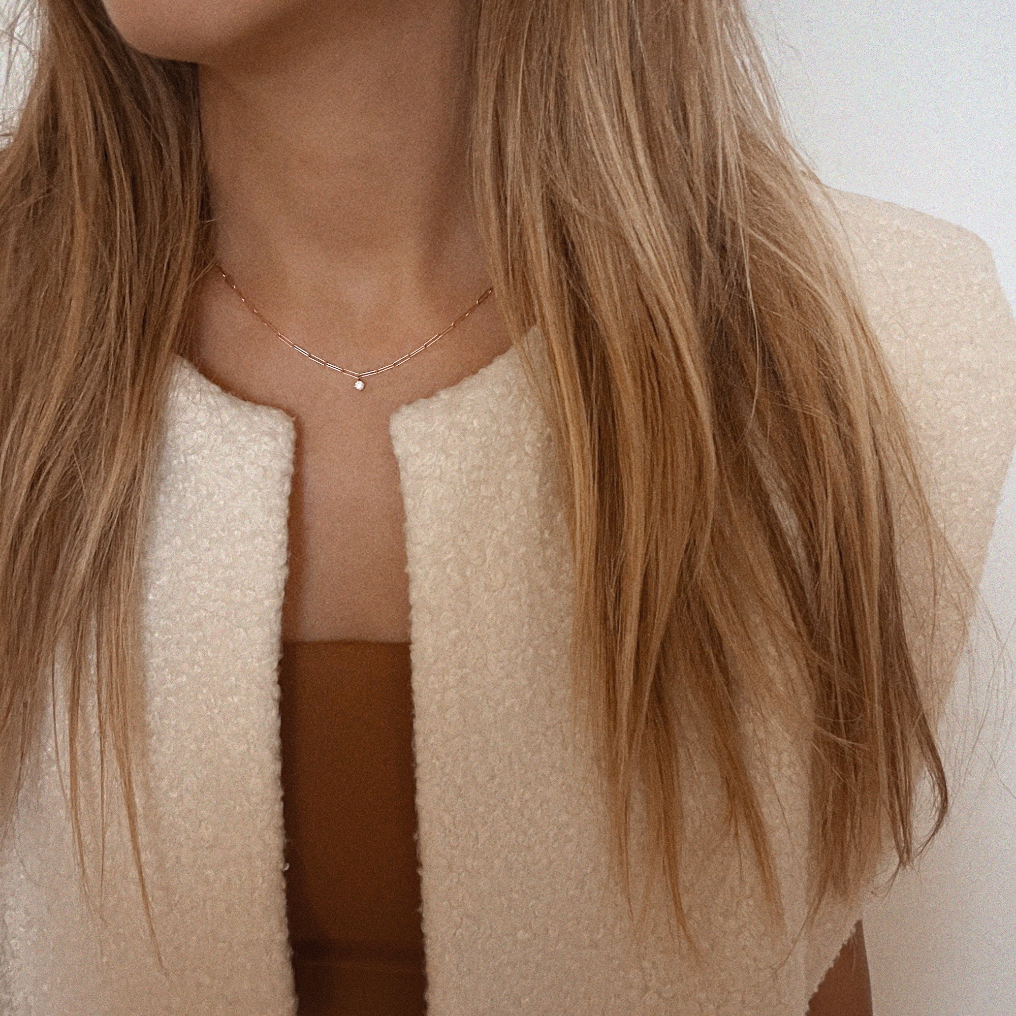 Portez une attention particulière à l'enchaînement des maillons modernes de cette chaîne shaman ainsi qu'à son sublime diamant de 0,11ct.