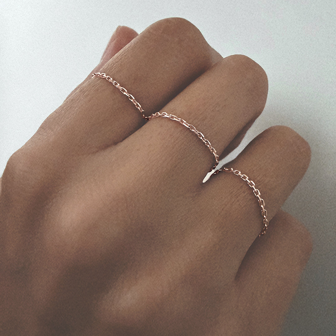 18k rose goldThe Calamity Jane chain ring in 18k rose gold charms with its simplicity and contemporary. look. Its delicate links wrap naturally around the finger, offering a piece of jewelry that’s easy to wear every day, on its own or stacked.