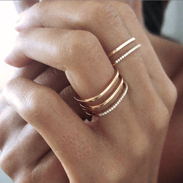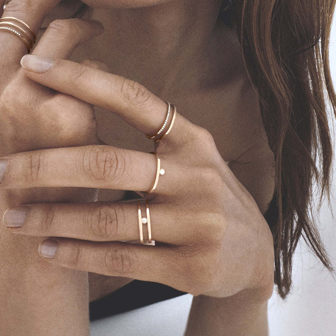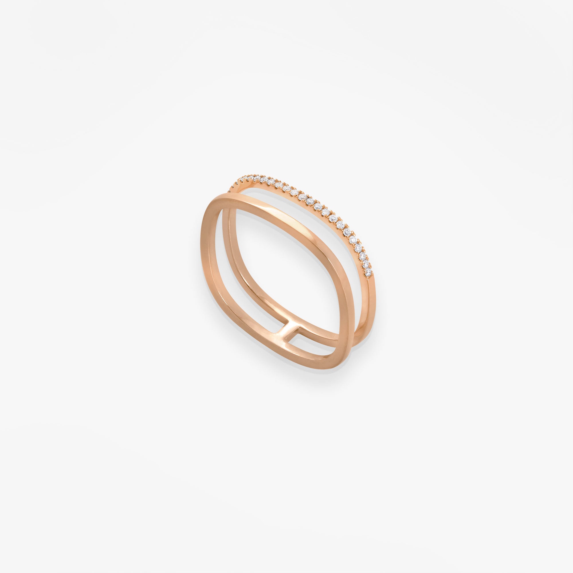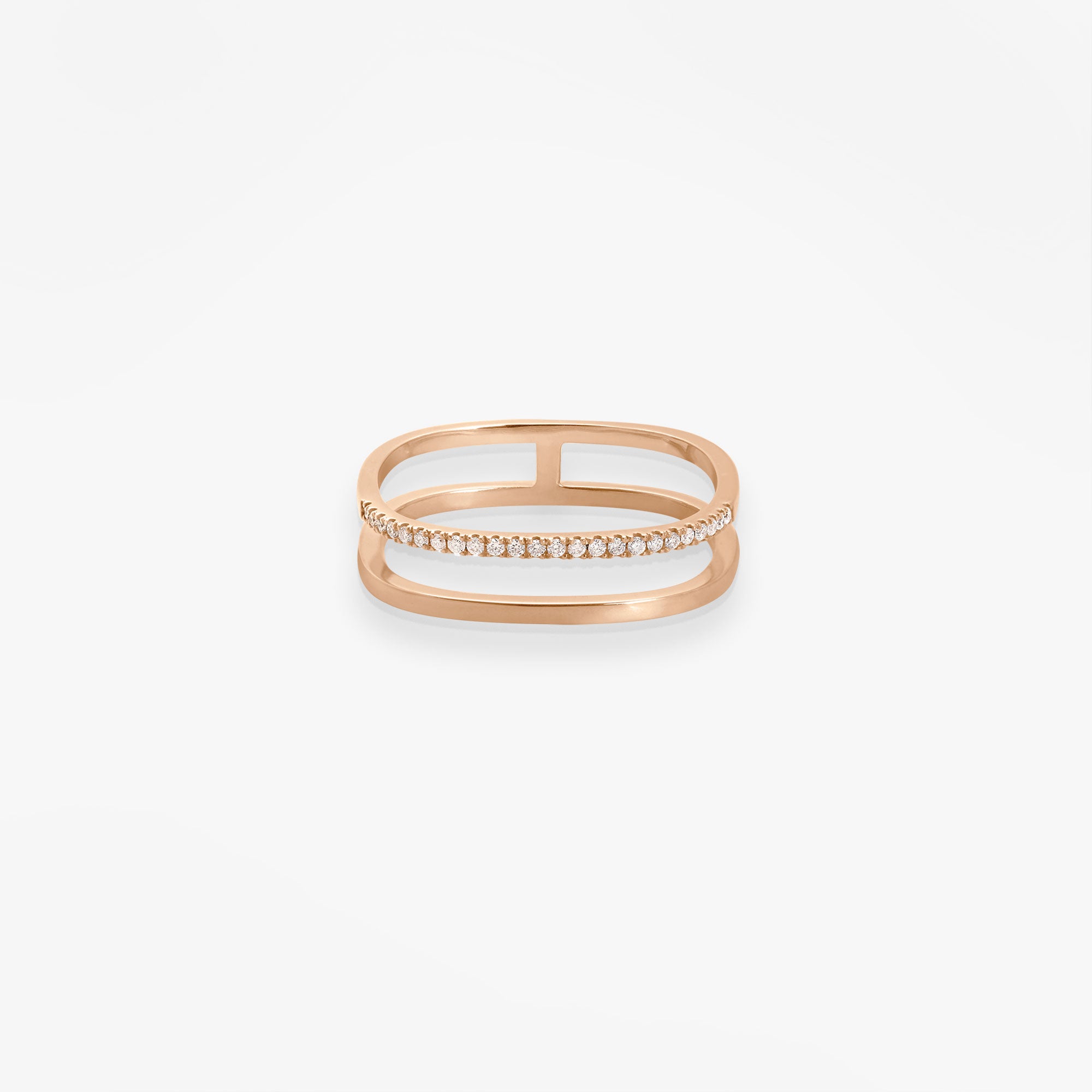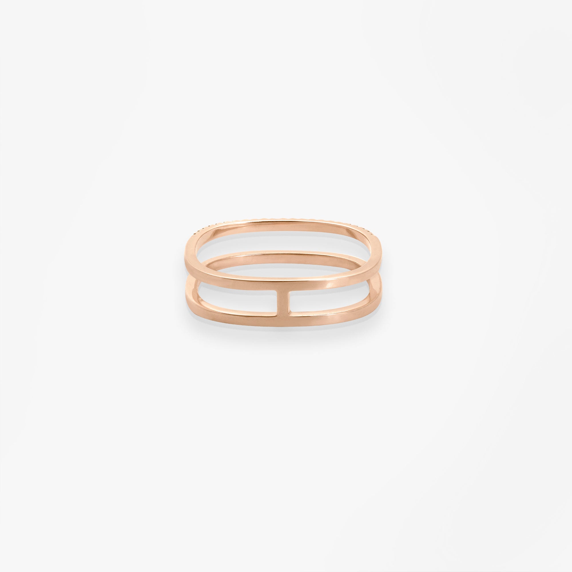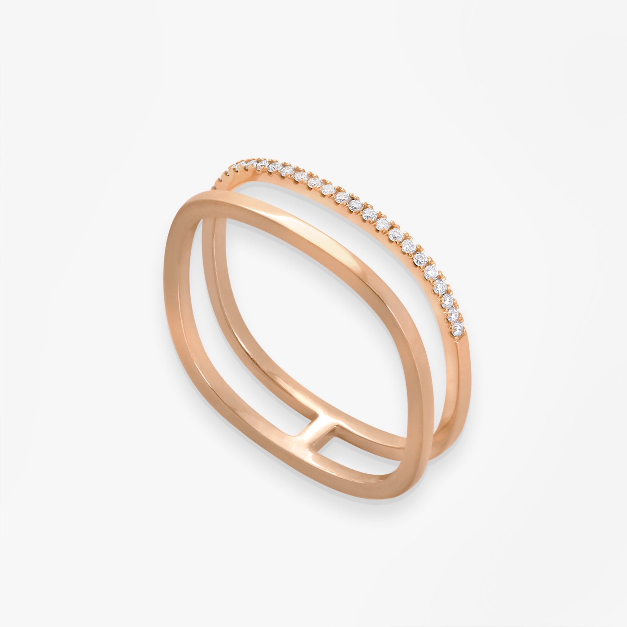 A square shaped double ring and semi-paved with a line of sparkling diamonds. It can be perfectly accumulated with other rings of the collection for a trendy attitude.