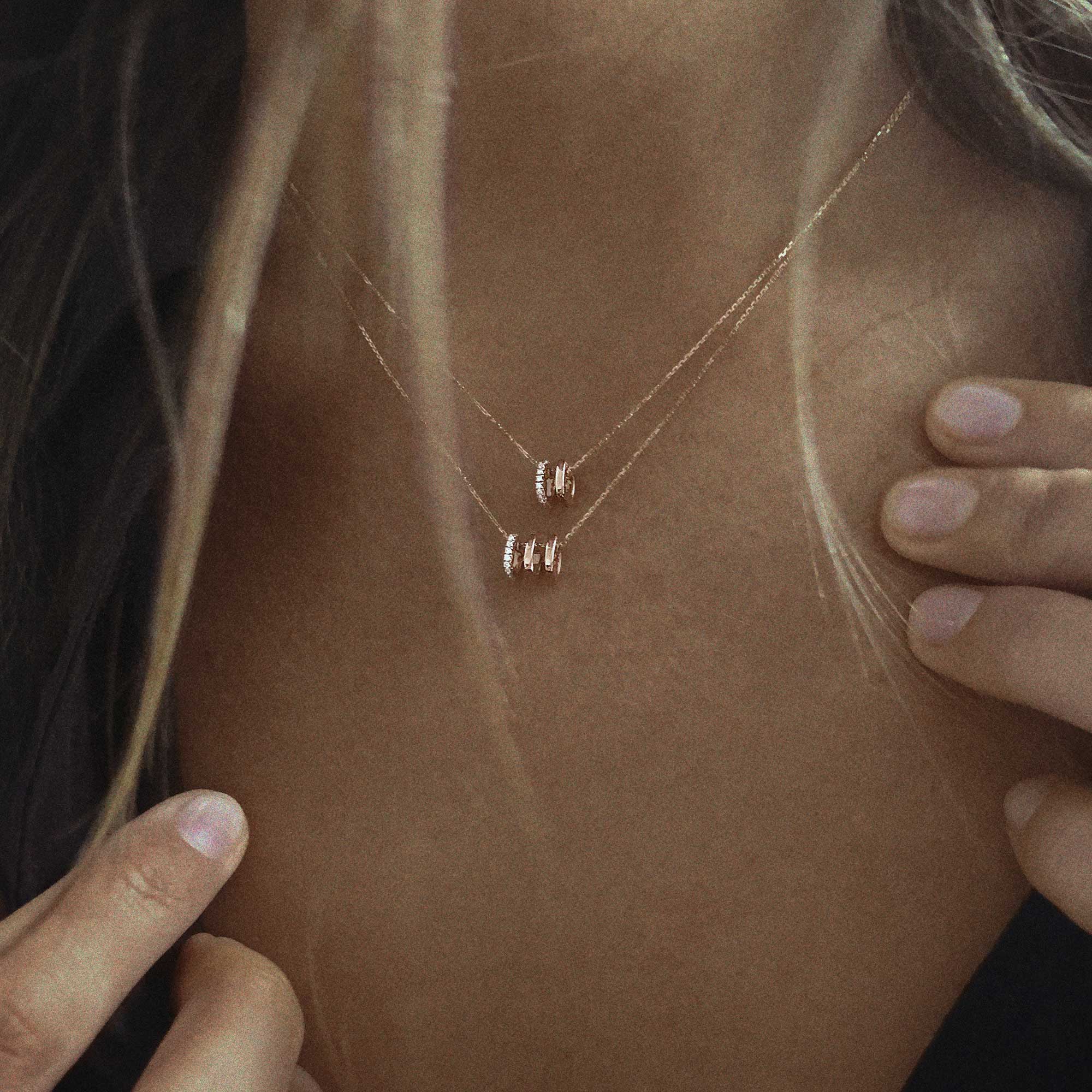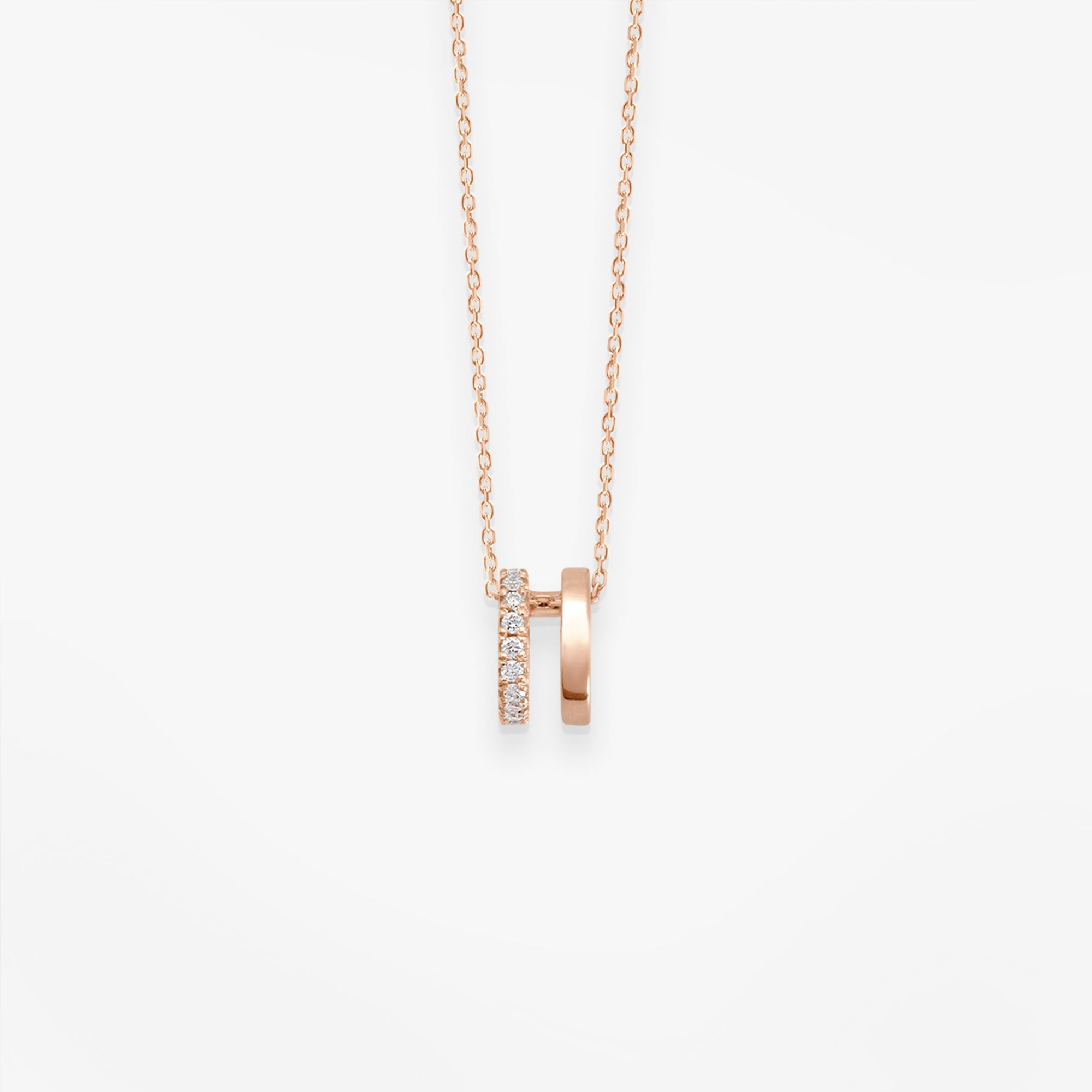 18k rose gold and diamondsThis necklace adorned with a double 18k gold ring and diamonds will slide freely along its fine chain.