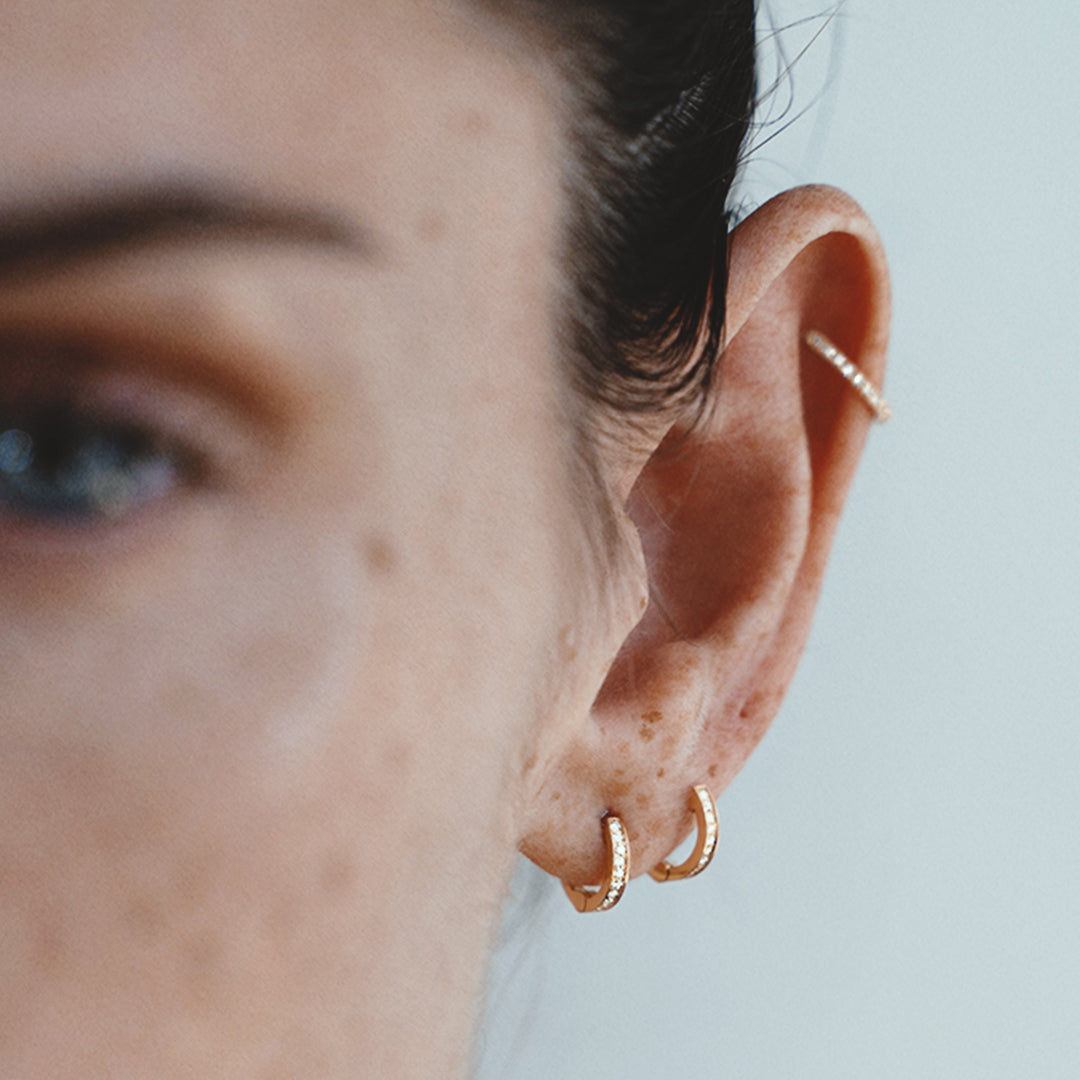 18k rose gold and diamondsA mini hoop in 18k gold either without diamond or entirely set with a succession of diamonds that come to match the lobe of your ear to the perfection. A must have to mix with other models to be trendy.
