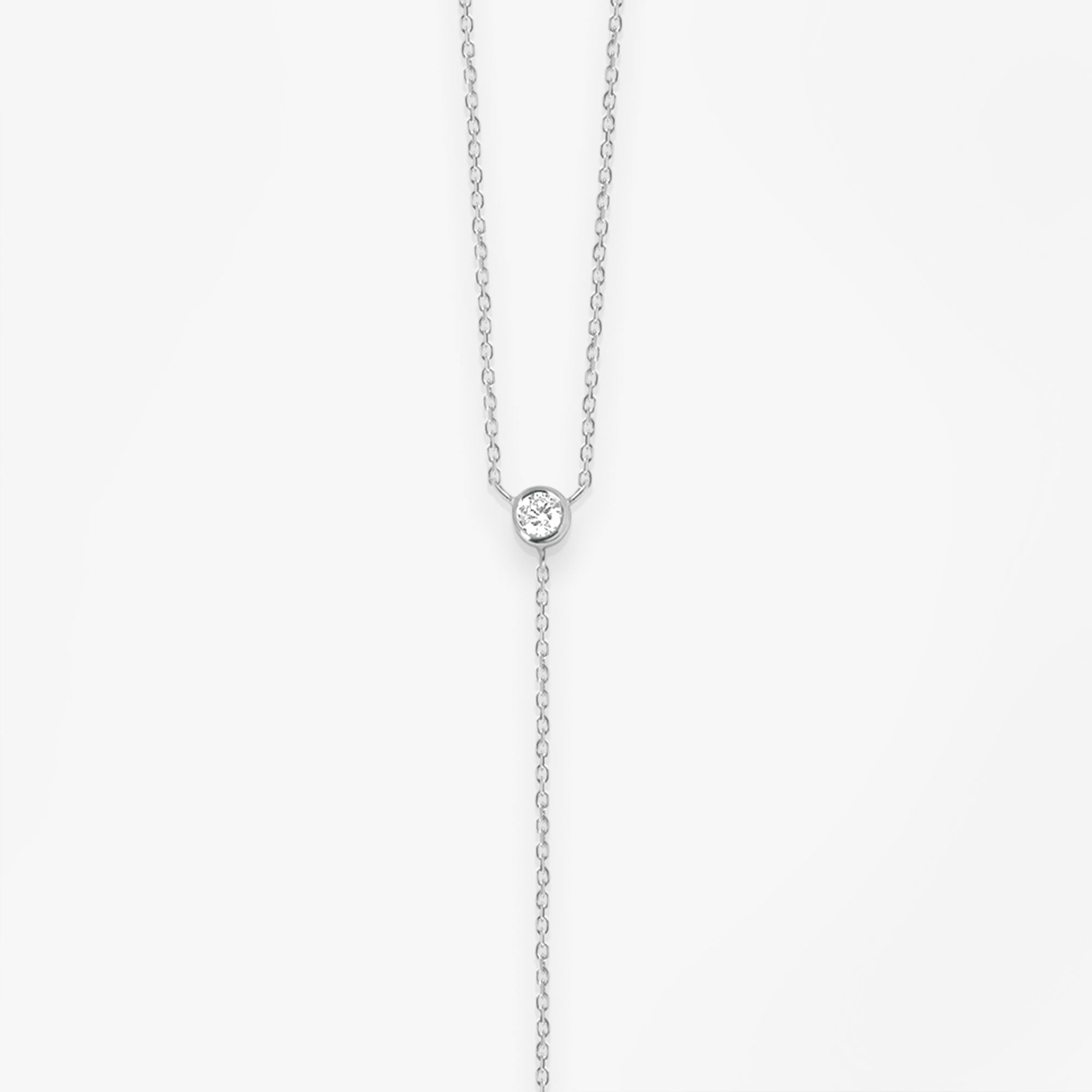 Or blanc 18k et diamantsUn collier iconique revisité. Un diamant serti sur une fine chaîne en or rose 18k sublimée par un second diamant lumineux.