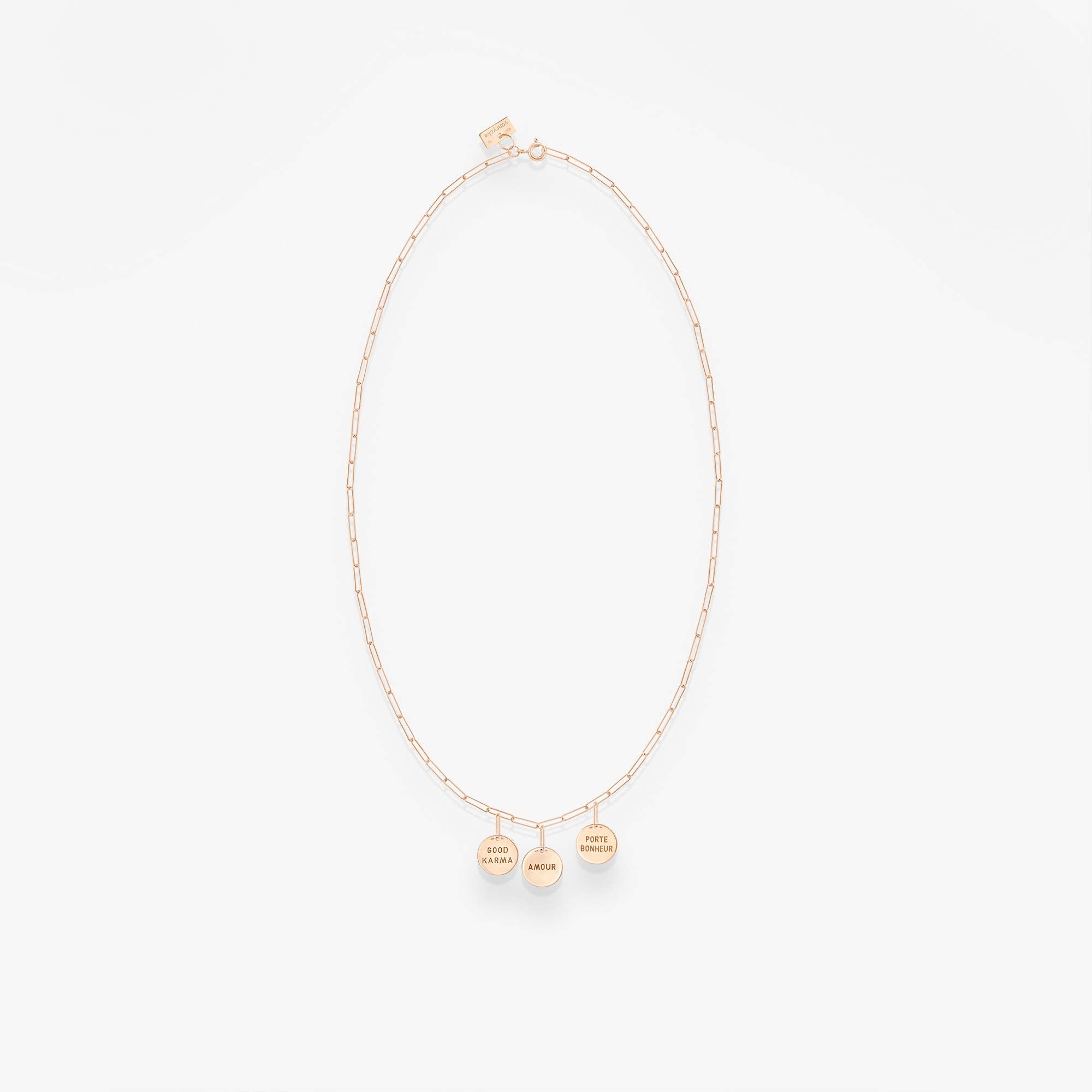 Collier en or rose 18k avec trois talismans good karma, amour et porte-bonheur.