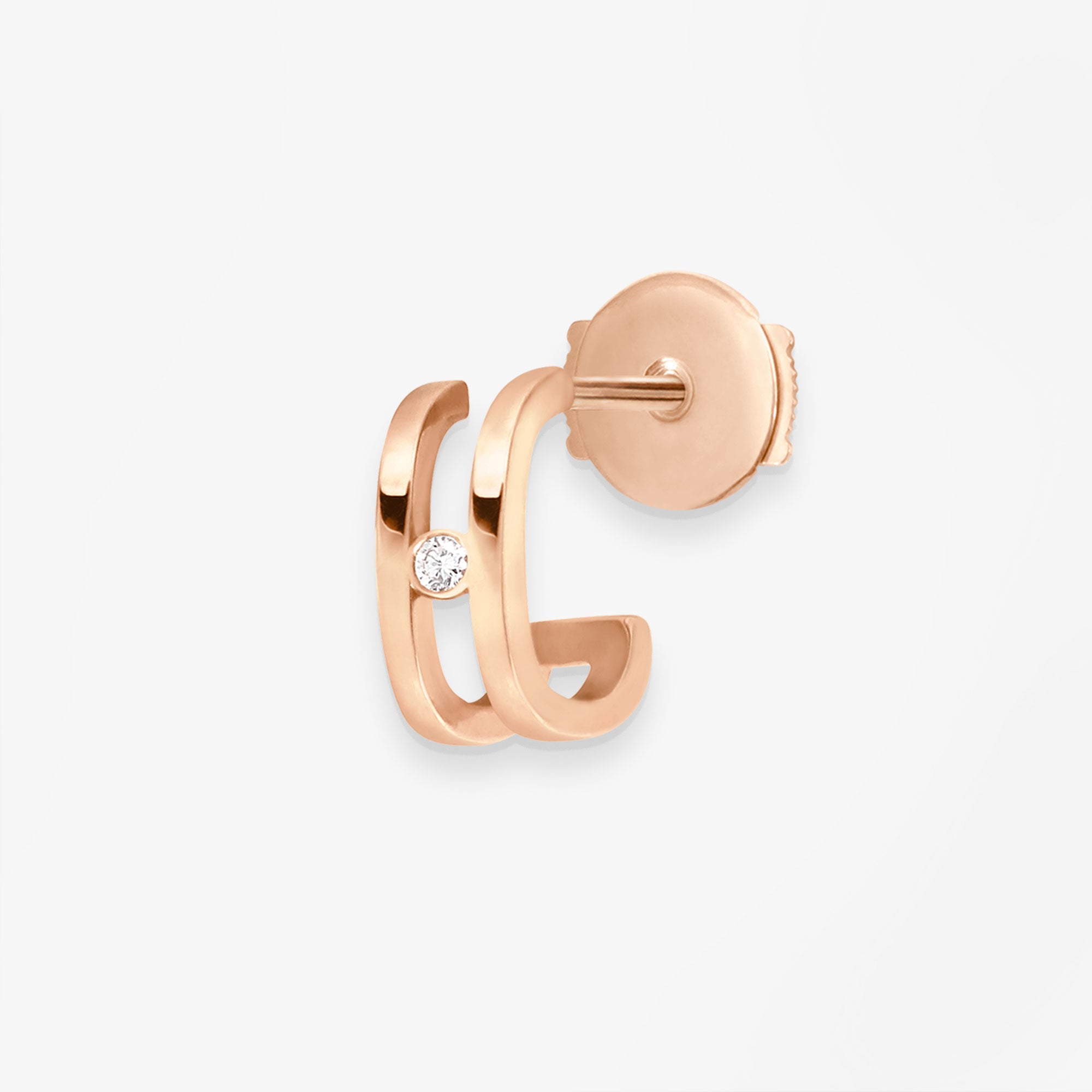 Or rose 18k et diamant oreille droiteDu renouveau dans la famille des créoles avec cet effet double créole serti d'un diamant blanc étincelant qui vient épouser à la perfection le lobe de l'oreille. Un must have à mixer et mélanger avec d'autres modèles pour être au cœur de la tendance.